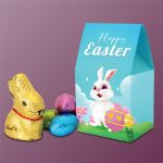 Spring style house shaped box with full colour bespoke all over print containing four foiled Milk Chocolate Eggs and a mini Lindt Golden Bunny.